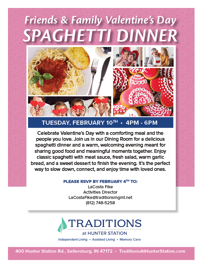 Celebrate Valentine’s Day with a comforting meal and the people you love. Join us in our Dining Room for a delicious spaghetti dinner and a warm, welcoming evening meant for sharing good food and meaningful moments together. Enjoy classic spaghetti with meat sauce, fresh salad, warm garlic bread, and a sweet dessert to finish the evening. It’s the perfect way to slow down, connect, and enjoy time with loved ones.