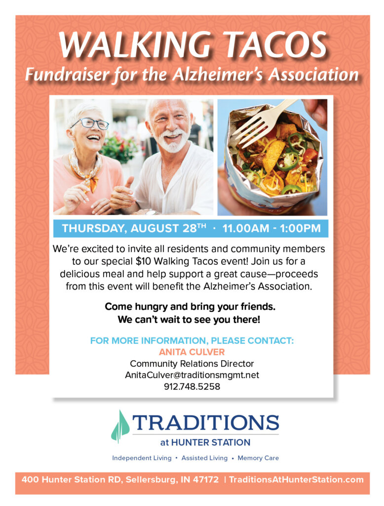 We’re excited to invite all residents and community members to our special $10 Walking Tacos event! Join us for a delicious meal and help support a great cause - proceeds from this event will benefit the Alzheimer’s Association. Come hungry and bring your friends. We can’t wait to see you there!